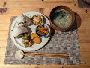お味噌汁は切り干し大根入り、栄養バランス満点だし、おにぎりの進むおかずたちと、お米のおいしいおにぎりで大満足です。