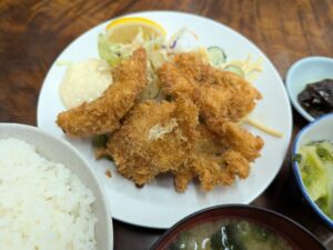 孤独のグルメを見たからにはまず定食でしょう。なんとなく揚げ物の気分だったので、お魚を差し置いてエビフライを頼むことに。