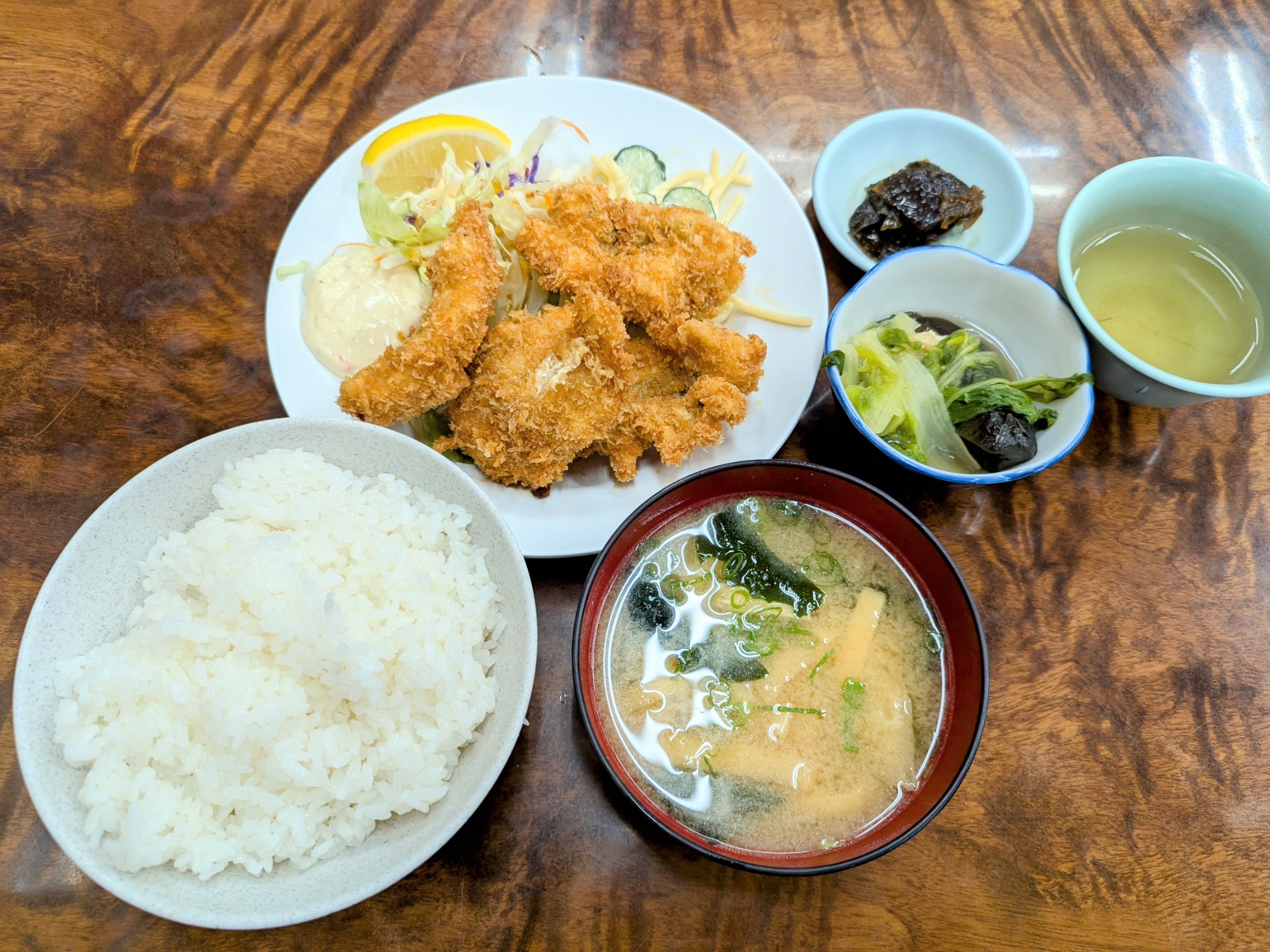 孤独のグルメを見たからにはまず定食でしょう。なんとなく揚げ物の気分だったので、お魚を差し置いてエビフライを頼むことに。