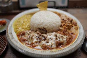 右手にあるのは、「3種ナッツの香ばし鶏キーマ」。看板メニューといえばこれ、とお店側からも推されているやつです。